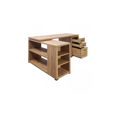 Le bureau d’angle Orda est doté d’un caisson à 3 tiroirs spacieux, 3 niches et de 2 étagères ouvertes, idéales pour ranger vos documents, accessoires et fournitures de bureau.