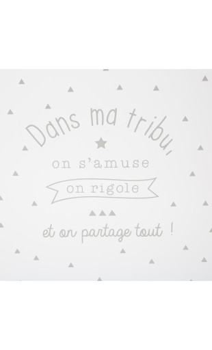 Message sur le devant ''Dans ma tribu, on s'amuse, on rigole et on partage tout.' + décor étoiles et triangles.
