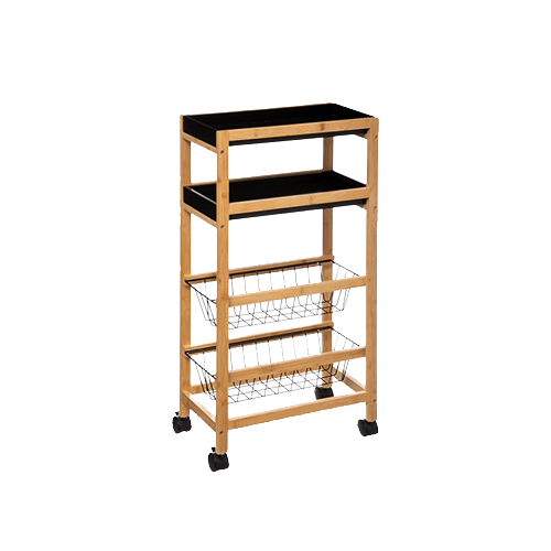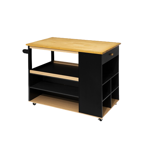 Pratique et bicolore, cette desserte vous offre de nouveaux espaces de rangement tout en donnant du style à votre cuisine. Desserte composée d'un plateau en hévéa massif + 1 tiroir + 3 étagères bois + 4 roulettes directionnelles. L'étagère supérieure est conçue pour recevoir 4 bouteilles. En bois massif et fibres de bois (MDF). Coloris noir et naturel. A monter soi-même. Dimensions : largeur 58 cm, profondeur 48 cm, hauteur 87 cm. Poids 14 kg.