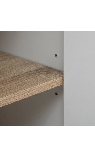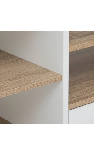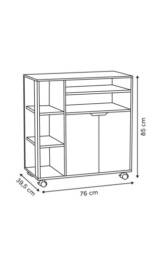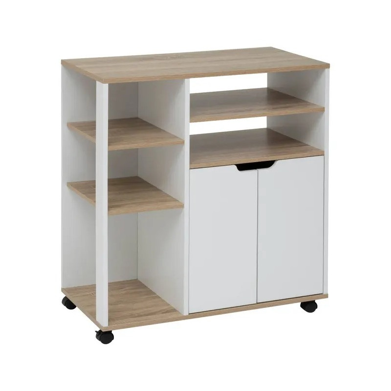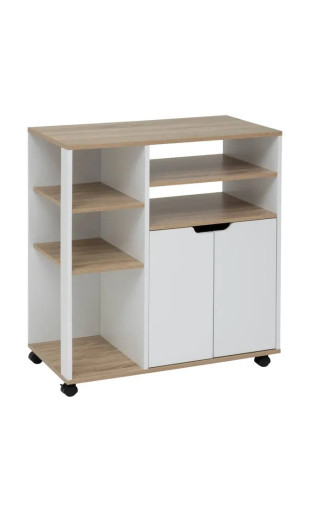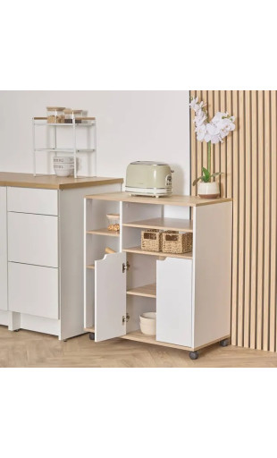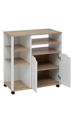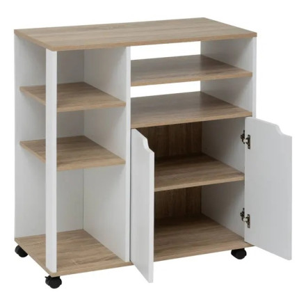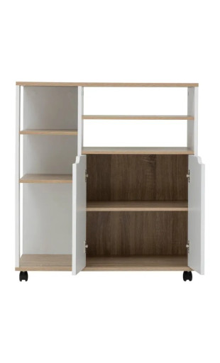 Cette desserte est équipée de multiples étagères ouvertes, idéales pour garder à portée de main vaisselle, bocaux, petit électroménager ou accessoires de cuisine. Elle dispose également de 2 portes battantes dissimulant une étagère intérieure, parfaite pour un rangement plus discret.