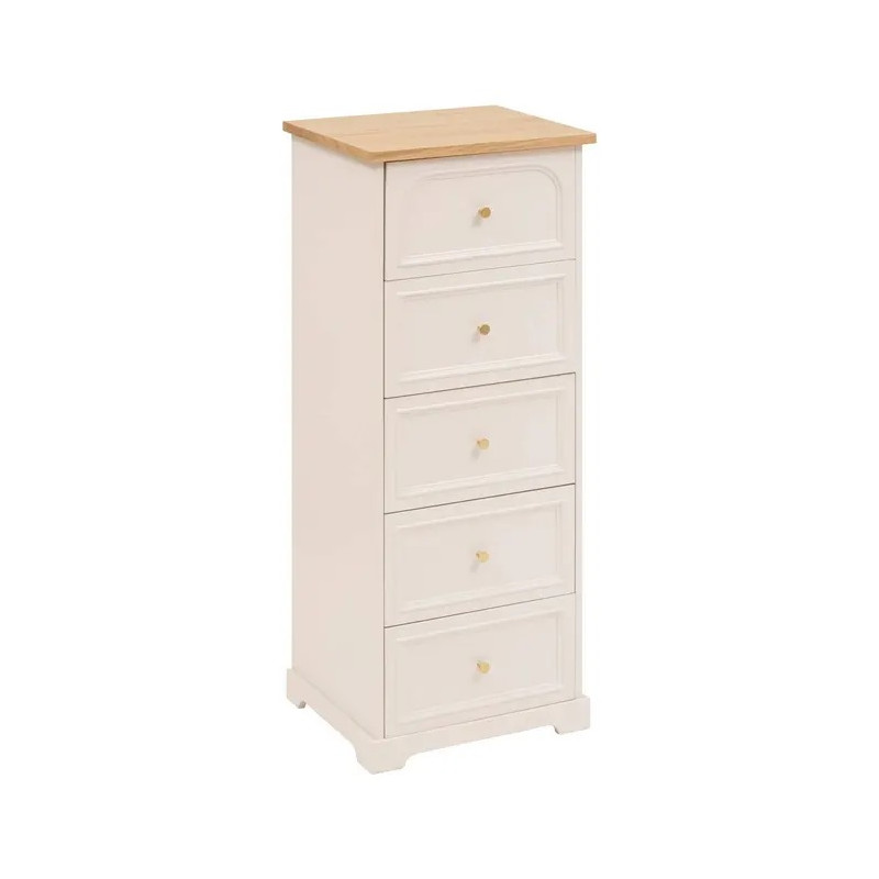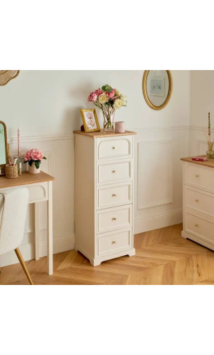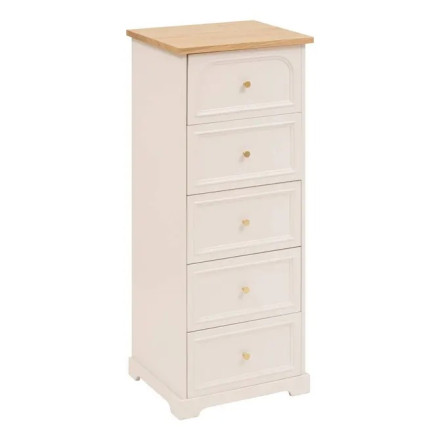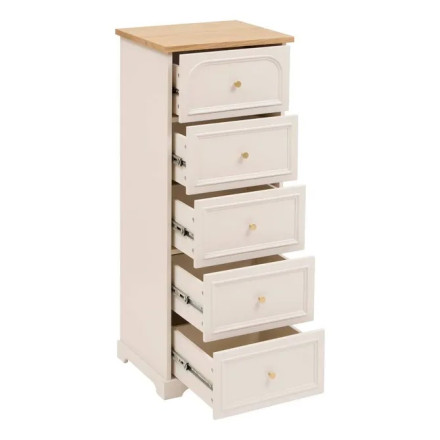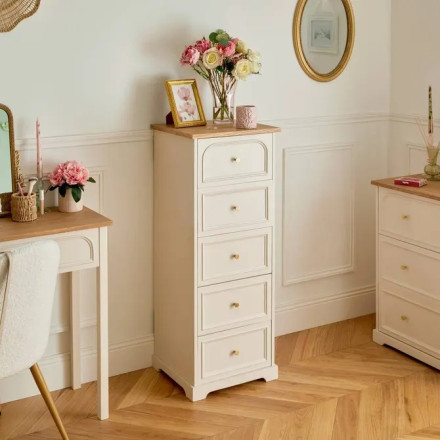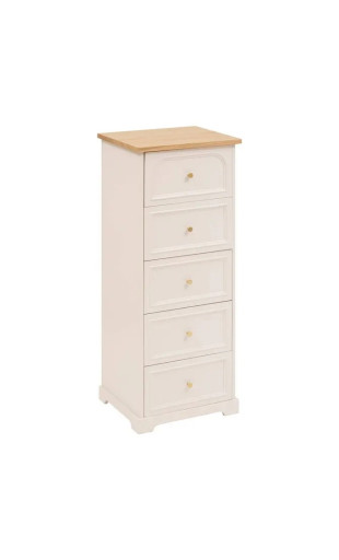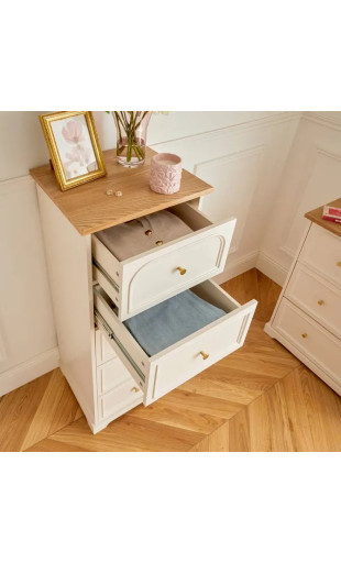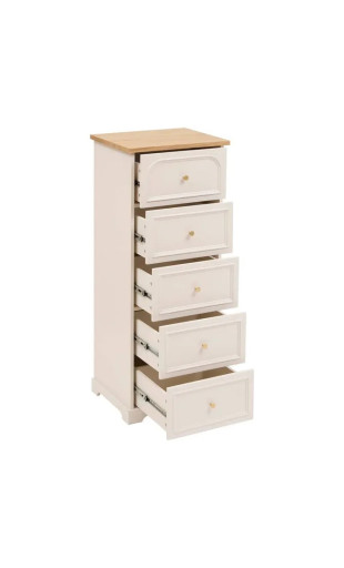 Avec ses cinq tiroirs dotées de glissières à fermeture douce, il offre un large espace de rangement pour vos papiers, petit linge ou accessoires, tout en gardant une allure élégante.