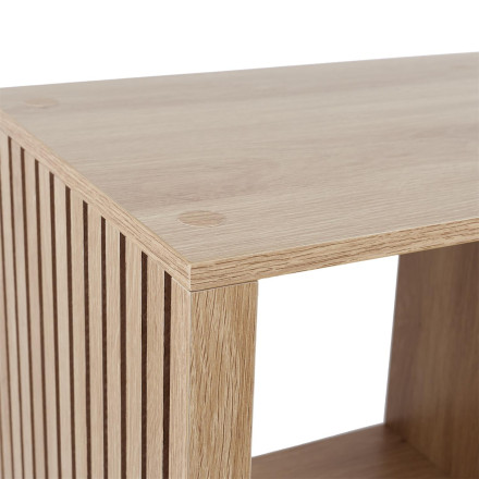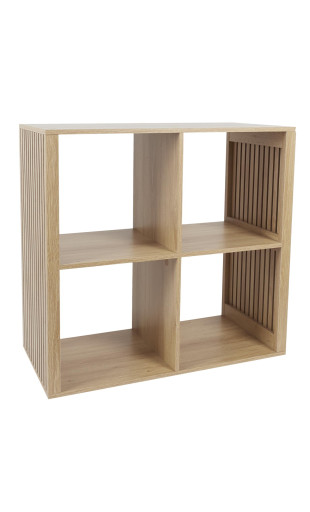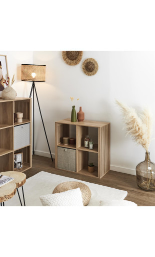 Apportez style et praticité à votre intérieur avec l’étagère 4 cases Klaus effet tasseaux. Conçue pour allier fonctionnalité et esthétique, elle se distingue par ses façades texturées à effet tasseaux, qui offrent un rendu moderne et chaleureux.