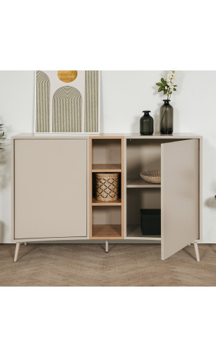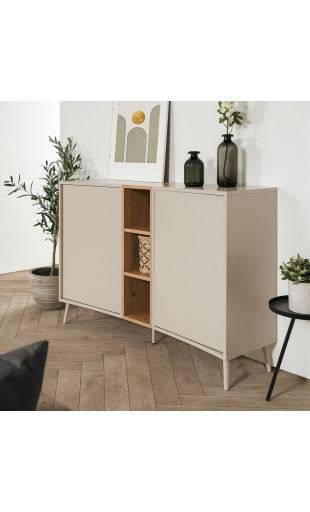 Apportez du caractère et de la modernité à votre intérieur avec le buffet Sinop, un meuble de rangement au design incurvé original, pensé pour allier esthétique contemporaine et fonctionnalité. Son association de teintes sable et effet chêne artisan crée une ambiance chaleureuse et élégante, idéale pour le salon, la salle à manger ou l’entrée.