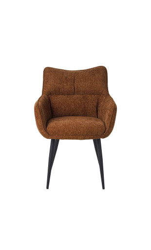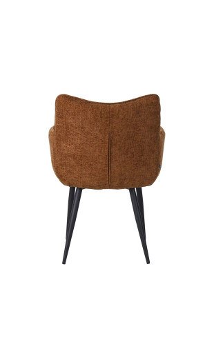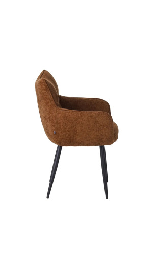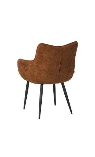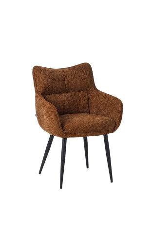 Son revêtement en tissu marron * chaleureux, sa forme coque ergonomique et ses pieds en métal robustes en font une assise à la fois élégante et confortable, idéale pour de longs repas ou moments conviviaux.