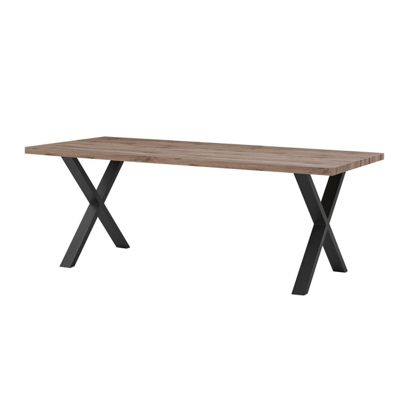 La table Ariel séduit par son plateau rectangulaire aux lignes épurées et ses pieds en croix en métal noir qui lui confèrent un caractère industriel chic.