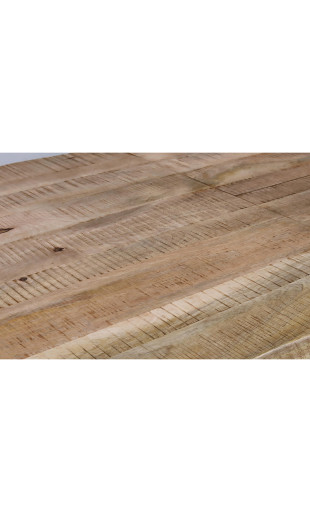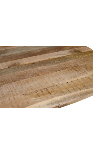 Le plateau est réalisé en bois de manguier massif, un matériau reconnu pour sa robustesse, sa durabilité et son esthétique naturelle. Chaque table est unique : les rainures naturelles du bois, les veinages et les nuances peuvent varier d’un modèle à l’autre, faisant de chaque pièce un meuble authentique et singulier.