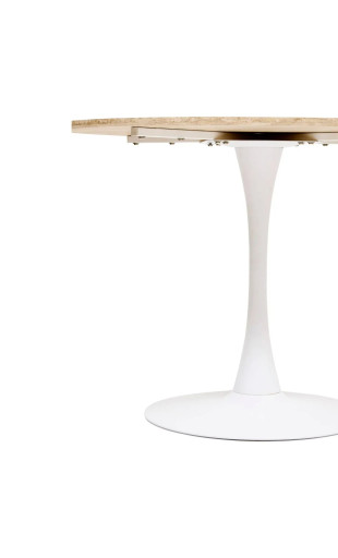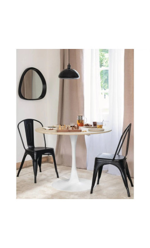 Son pied central en métal blanc apporte stabilité et légèreté visuelle, tout en offrant un design épuré qui facilite l’installation des chaises autour de la table.