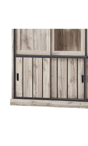 La partie haute, quant à elle, combine 2 portes vitrées coulissantes – idéales pour exposer votre plus belle vaisselle ou vos objets déco – et 2 portes pleines coulissantes pour dissimuler ce que vous souhaitez garder à portée de main, mais à l’abri des regards.