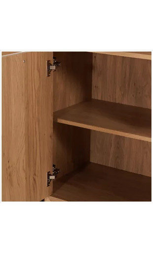 Cette vitrine allie esthétique et praticité grâce à son design équilibré : les portes vitrées permettent de mettre en valeur votre vaisselle, vos verres ou vos objets déco, tandis que les portes pleines offrent un espace de rangement fermé et discret.