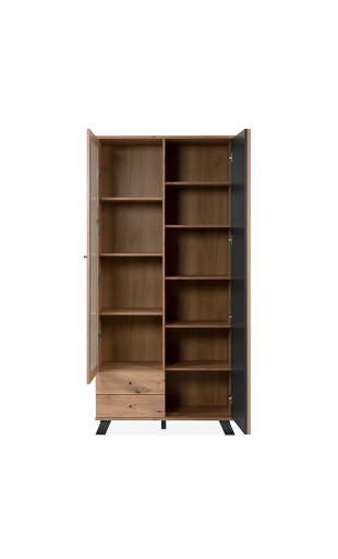 Cette élégante vitrine 2 portes 2 tiroirs Medan incarne l'alliance parfaite entre la chaleur de l'effet bois et la modernité du coloris anthracite.