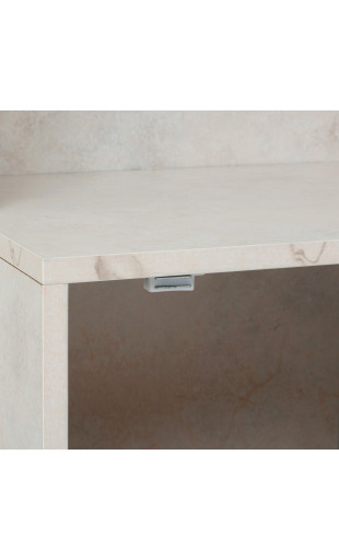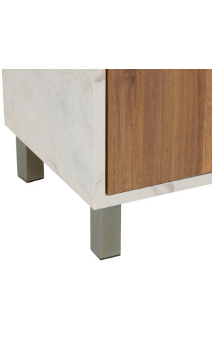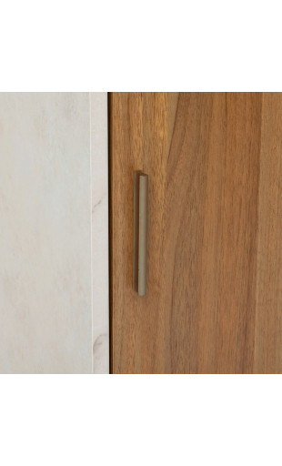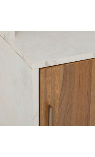 La finition effet travertin apporte un style minéral très actuel, tandis que les portes bois foncé renforcent le caractère élégant du meuble.