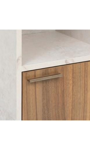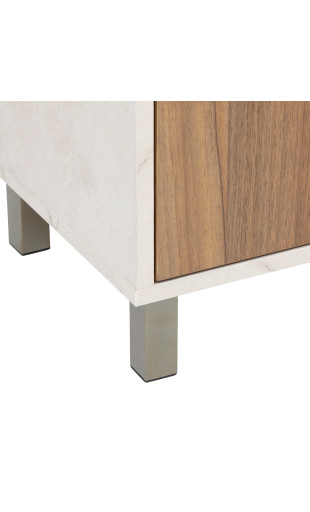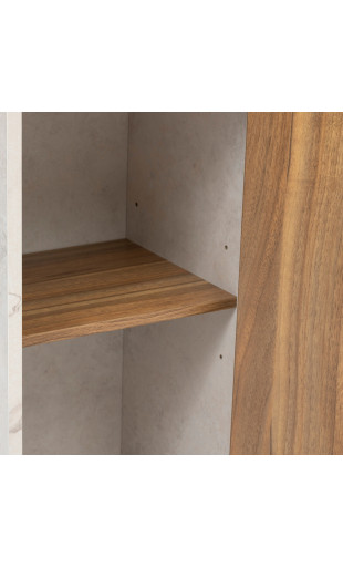 La finition effet travertin apporte un style minéral très actuel, tandis que les portes bois foncé renforcent le caractère élégant du meuble.
