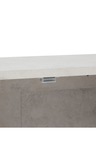 La finition effet travertin apporte un style minéral très actuel, tandis que les portes bois foncé renforcent le caractère élégant du meuble.