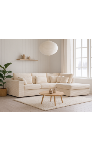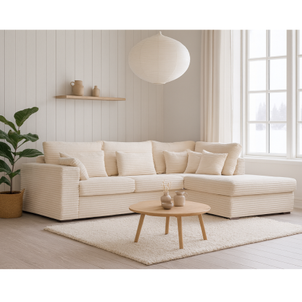 Créez un espace de vie élégant et confortable avec le canapé d'angle droit en velours côtelé beige Toronto. Ce canapé, alliant design contemporain et confort inégalé, est la pièce maîtresse idéale pour sublimer votre salon.