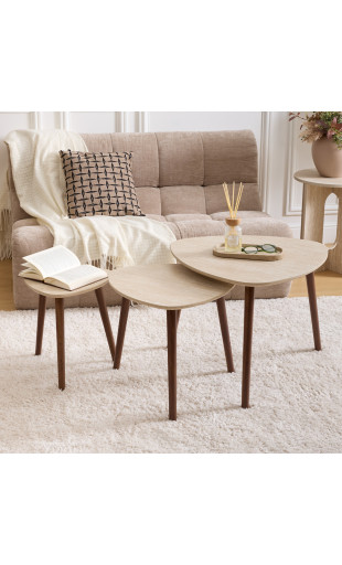 Chaque table repose sur des pieds en bois d’hévéa vernis teinté foncé, apportant contraste, chaleur et stabilité à l’ensemble.