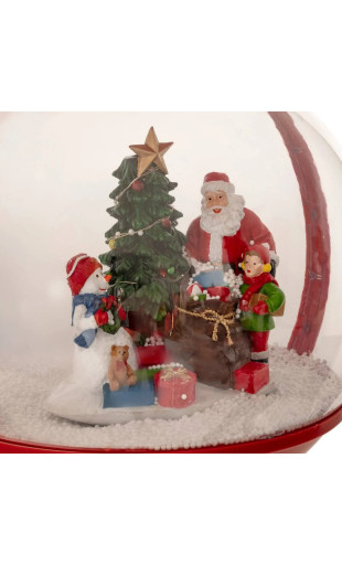 Effet neige tombante réaliste : la boule transparente renferme une neige animée qui tourbillonne doucement, comme dans une boule à neige géante.