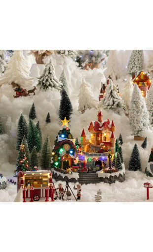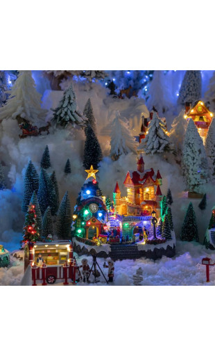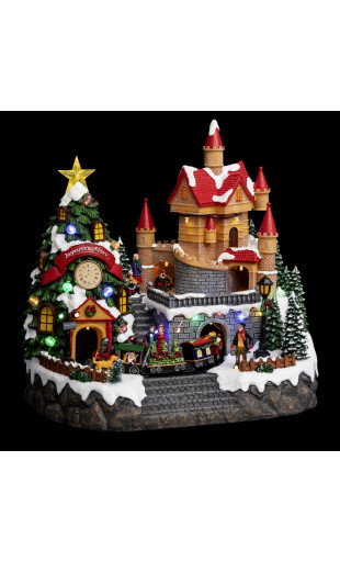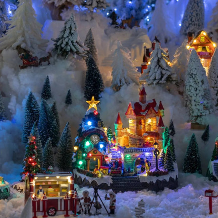 Découvrez le château du Père Noël avec son sapin lumineux et son train animé.