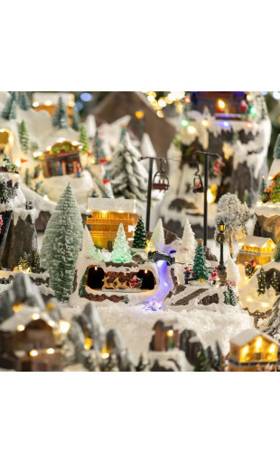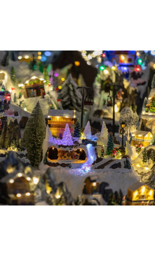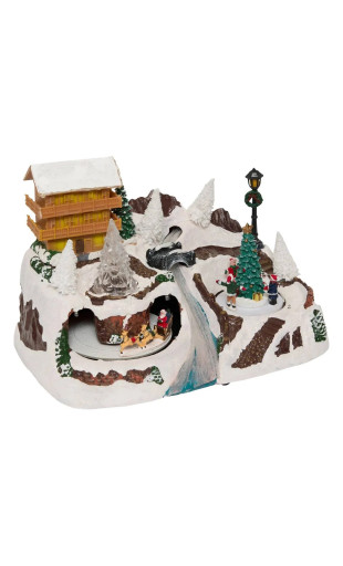 Village composé d'un chalet de montagne + un tunnel dans lequel tourne le père Noël et son traîneau + des enfants tournant autour d'un sapin + une grande rivière lumineuse.