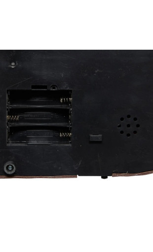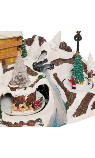 Décoré de neige, personnages, sapins et réverbère. Fonctionne à piles, non fournies.