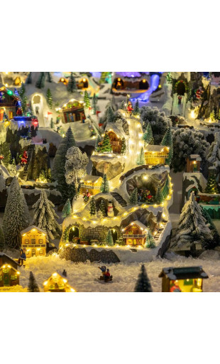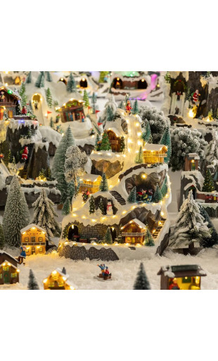 Village composé d'une montagne avec grottes + tunnel dans lequel roule un petit train + patinoire avec patineurs en mouvement + chalets.