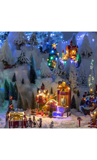 Village composé d'une usine en 3 bâtiments + passerelle sur laquelle glissent des cadeaux + vitrine tournante + lutins qui tournent sous un bâtiment.