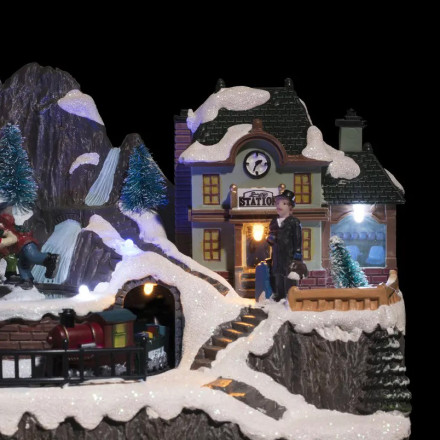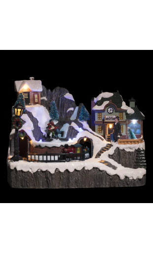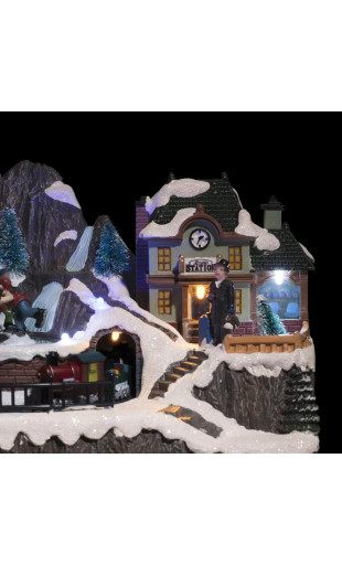 Plongez dans la magie de Noël avec ce charmant village lumineux animé représentant une gare enneigée et ses patineurs. Compact et détaillé, il mesure 23 cm de long et saura trouver sa place aussi bien sur une table, une étagère ou au cœur d’un décor de fête.